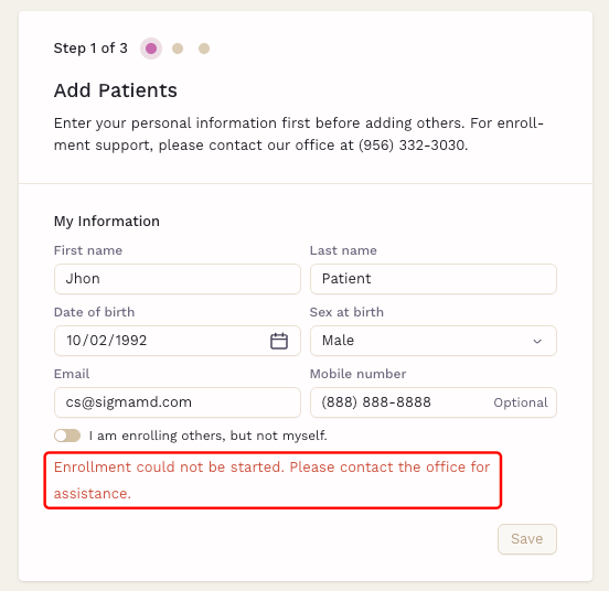 - “Enrollment could not be started. Please contact the office for assistance.”