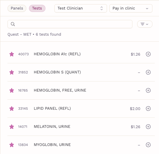 Your favorites will appear first when starting an order. You can also filter searches to show only your favorites, making it easier to find the right tests quickly.