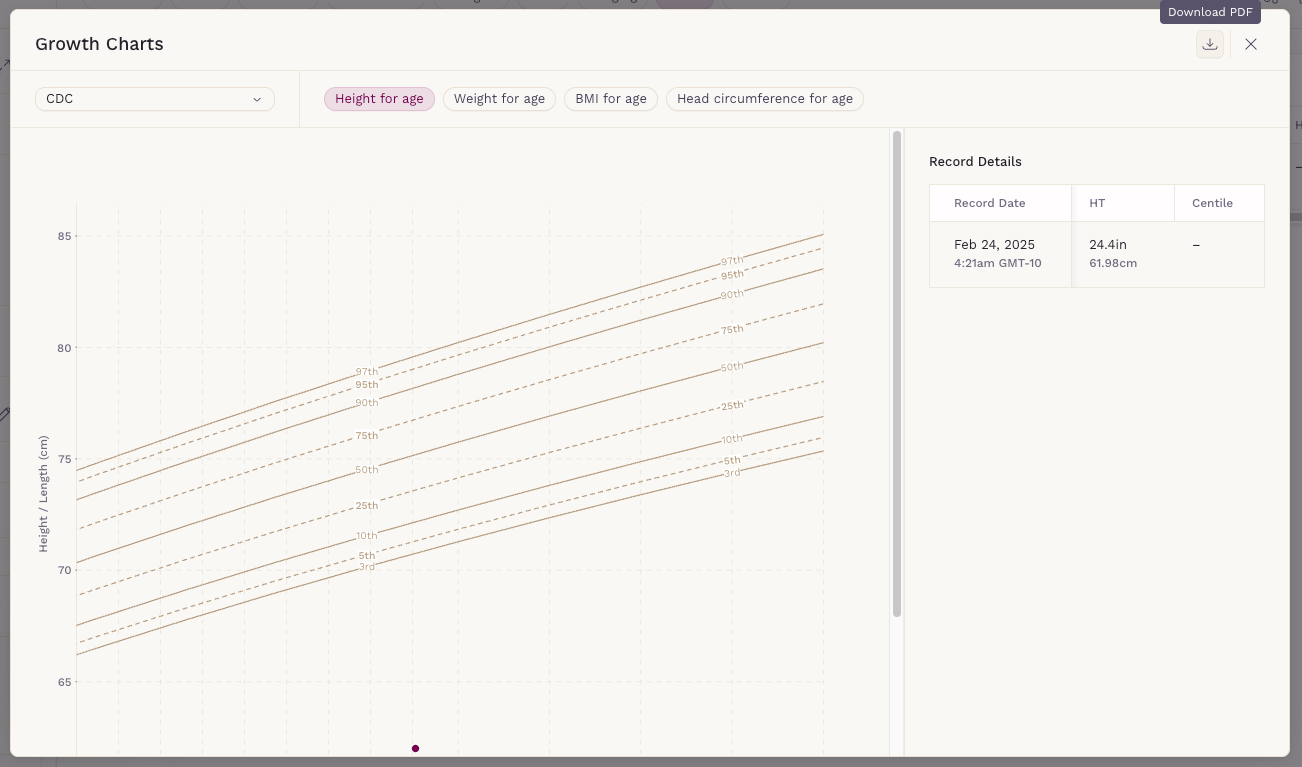 Growth Charts can now be downloaded as PDFs, making it easier to print, share, or store patient growth data for documentation.