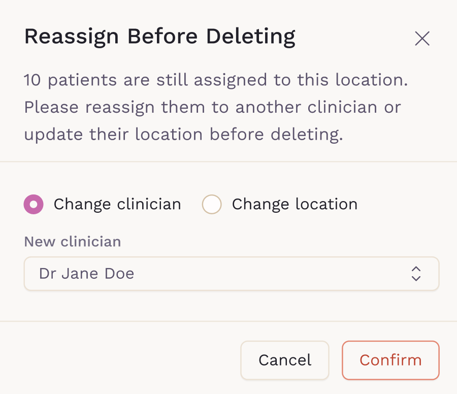 If you remove a location and the clinician has patients assigned at that site, you’ll be prompted to either reassign the patients to another location or reassign their clinician. This keeps patient records consistent across the practice.