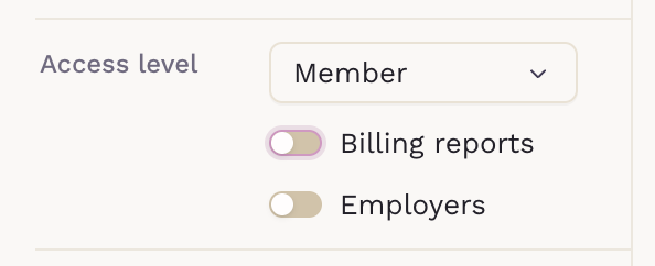 Later, when reviewing the team member profile, you can set whether non-admin users (Members) can access the practice's Billing Reports and Employers sections.