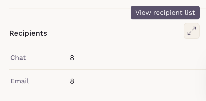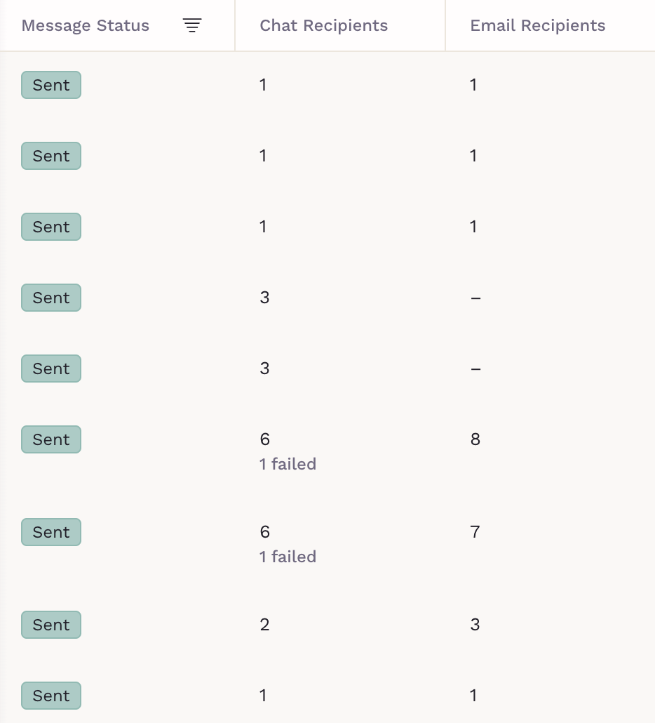 This shows a list of all your past messages, their send status, and the number of recipients for chat and email. If a delivery fail happens, it will be display underneath the recipients counter.