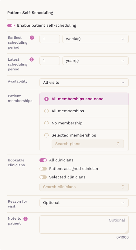 - Turn on 'Enable patient self-scheduling'.