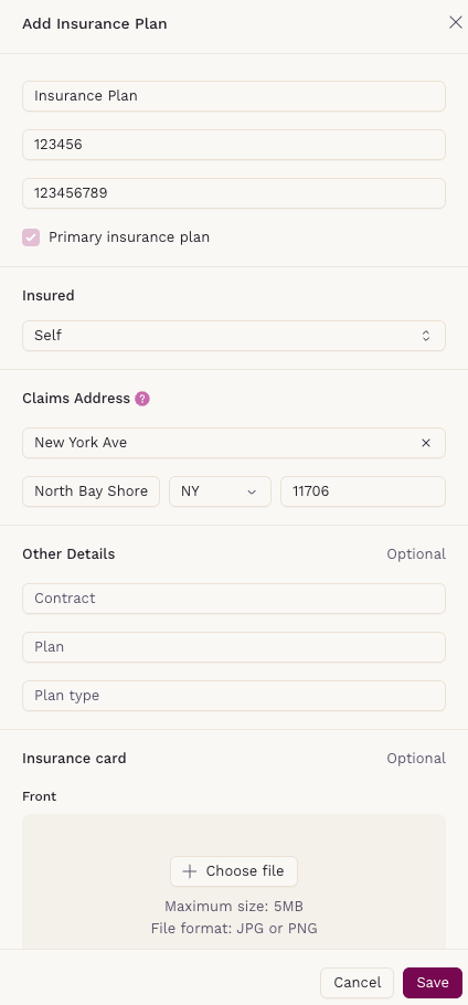 - The insurance plan will be saved to the patient’s profile.