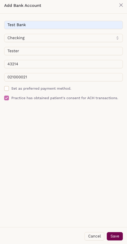 - Patients must consent to ACH transactions before saving.