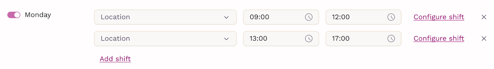 To add more than one shift in a day, click Add shift. To remove a shift, click the X button.