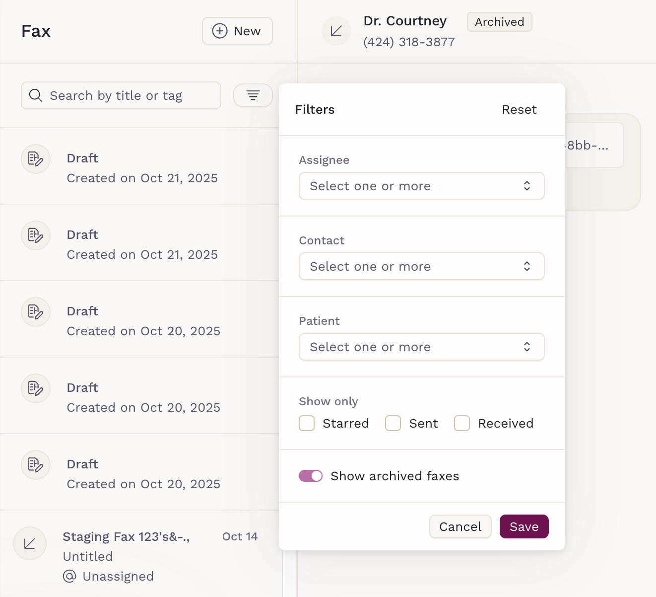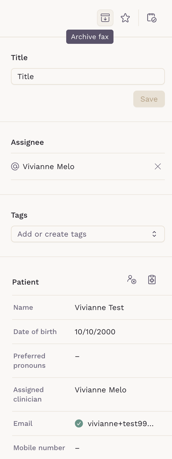 When receiving a fax, you can save it directly to a patient’s file. This ensures important documents stay organized and easily accessible within the patient’s drive.