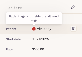 In such cases, a message appears in the patient’s membership view indicating that the patient is outside the valid age range for the current seat.