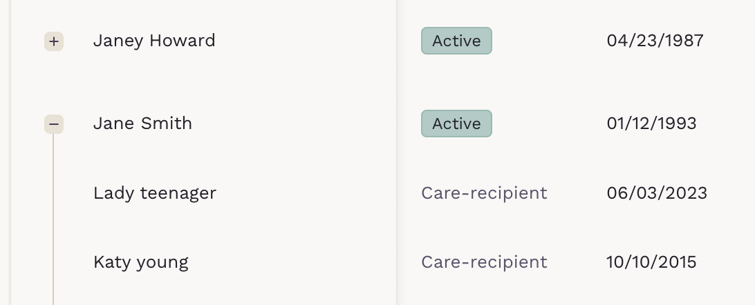 The patient list now shows each patient’s caregivers or care recipients. Select the + icon beside a name to expand their connections.