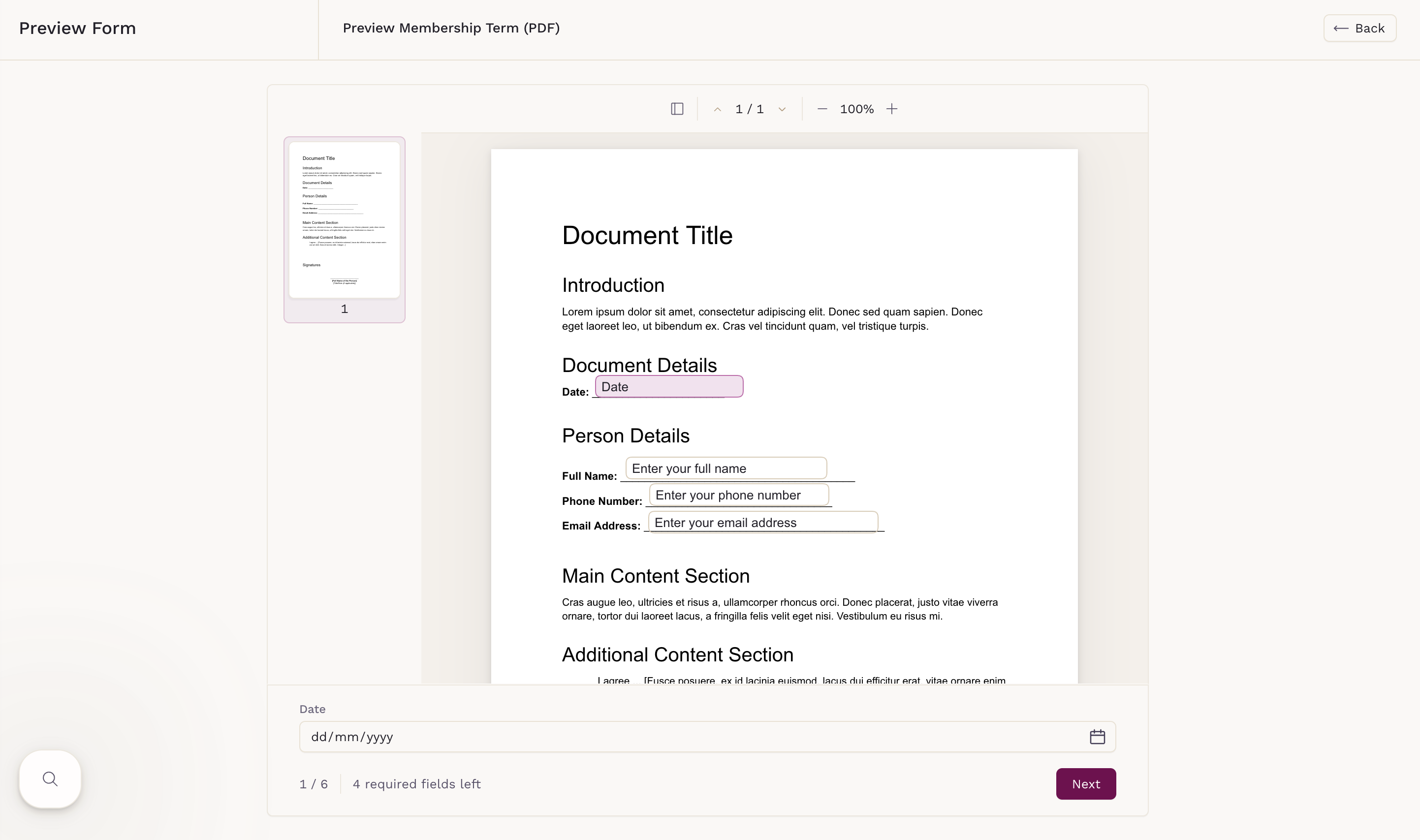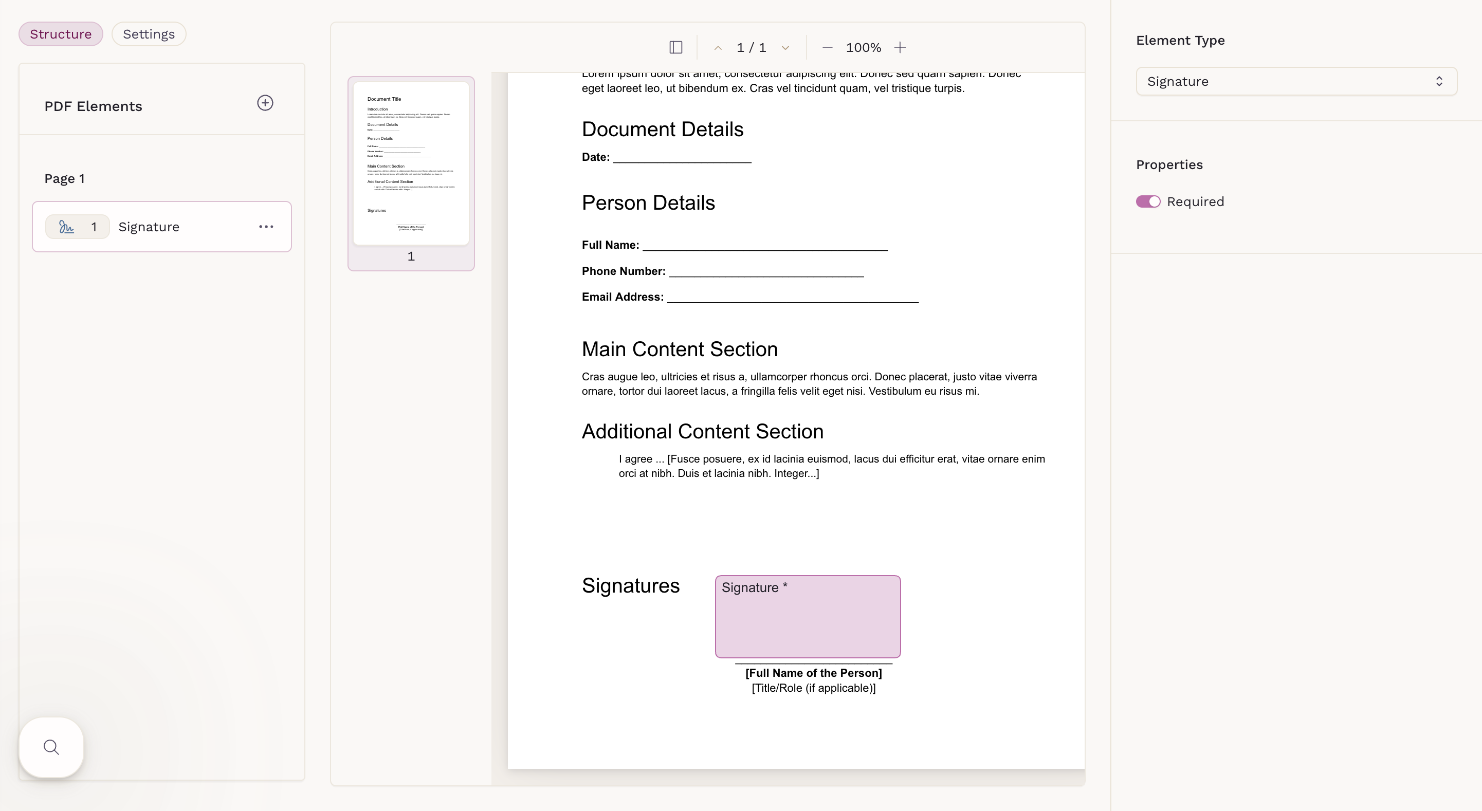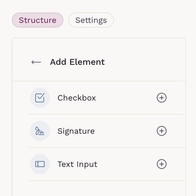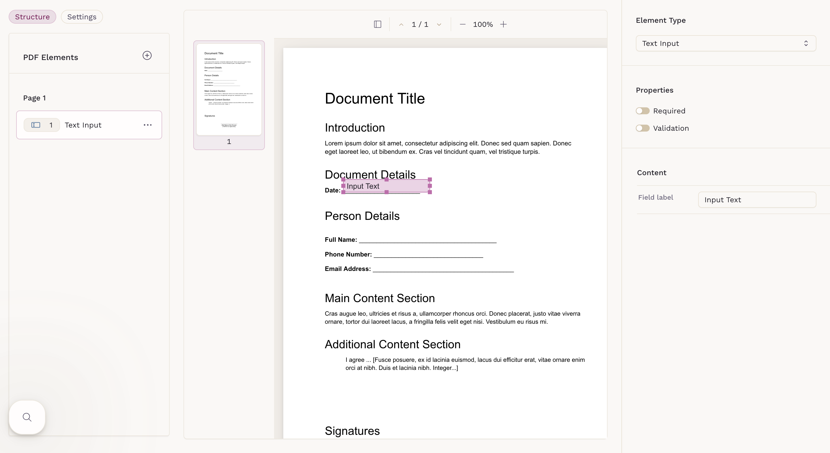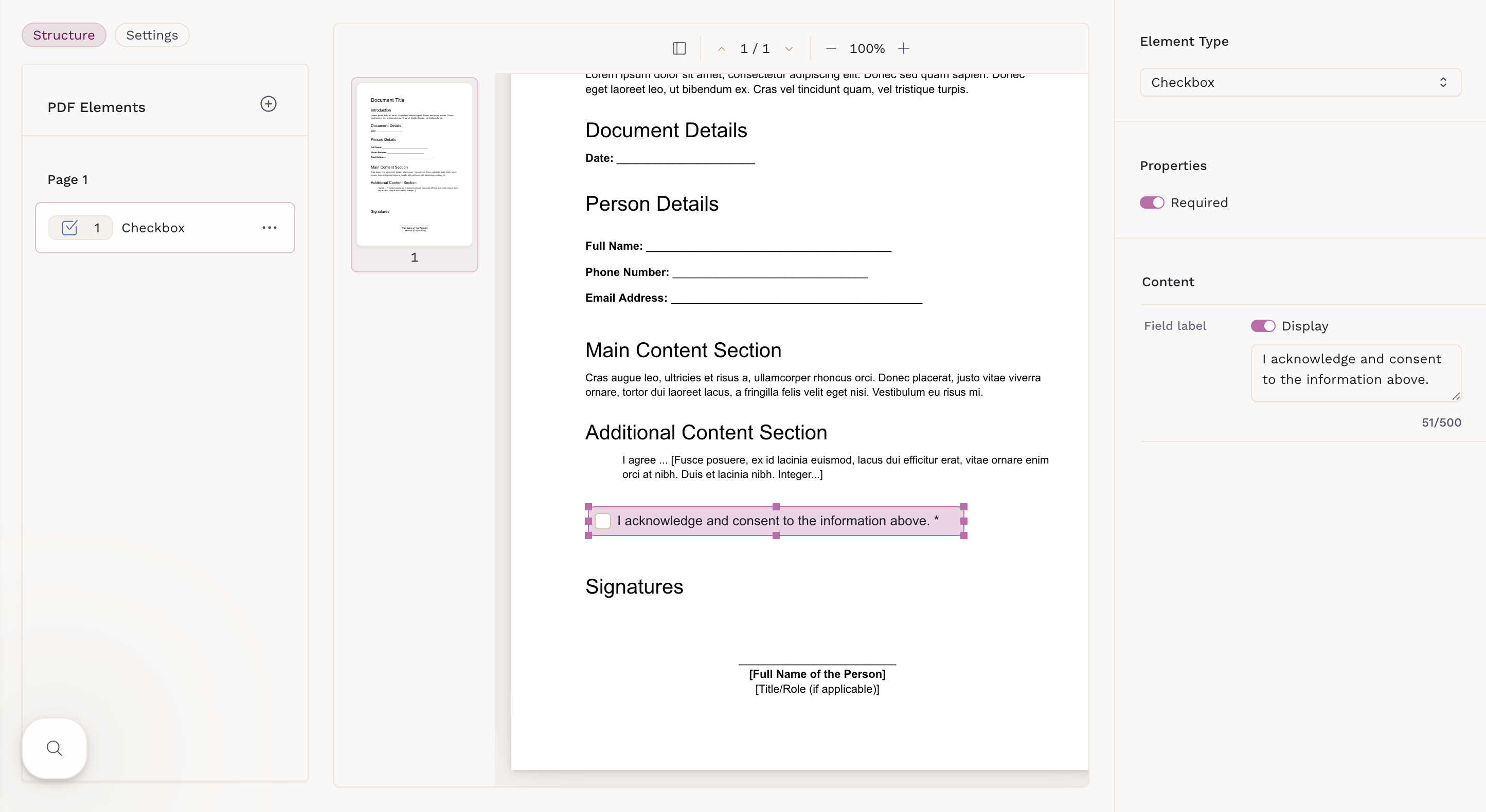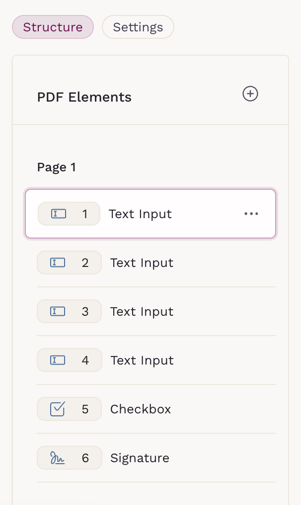 Interactive PDF Forms support three element types: Checkbox, Signature, and Text Input. Each element can be placed anywhere on the document to match the layout of your original PDF.
