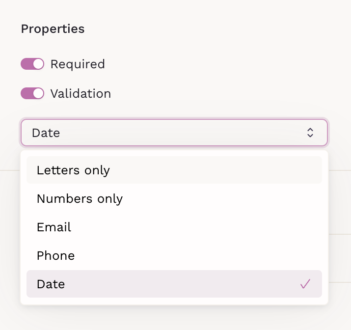 Once enabled, validation prevents the patient from submitting until the response meets the defined format.