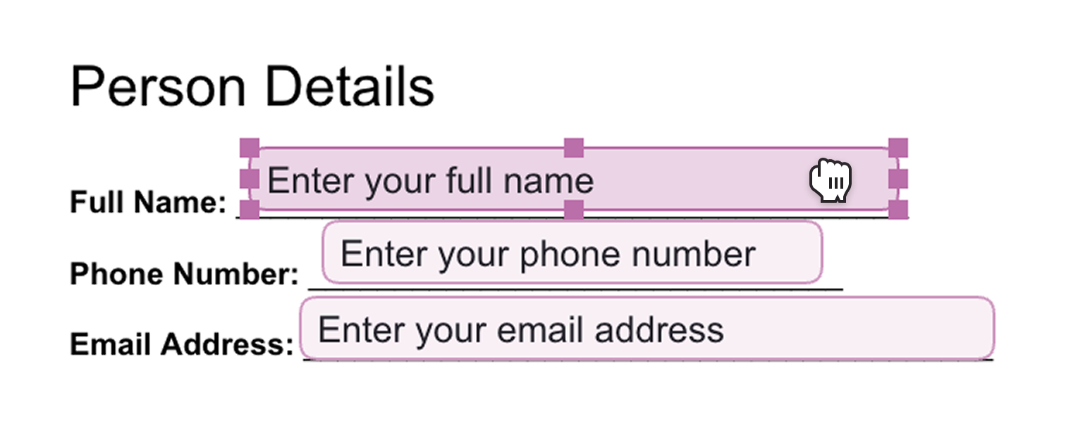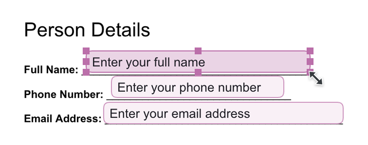 Checkboxes and text inputs include draggable handles that let you adjust their width and height, making it easy to align each field with the layout of your PDF.