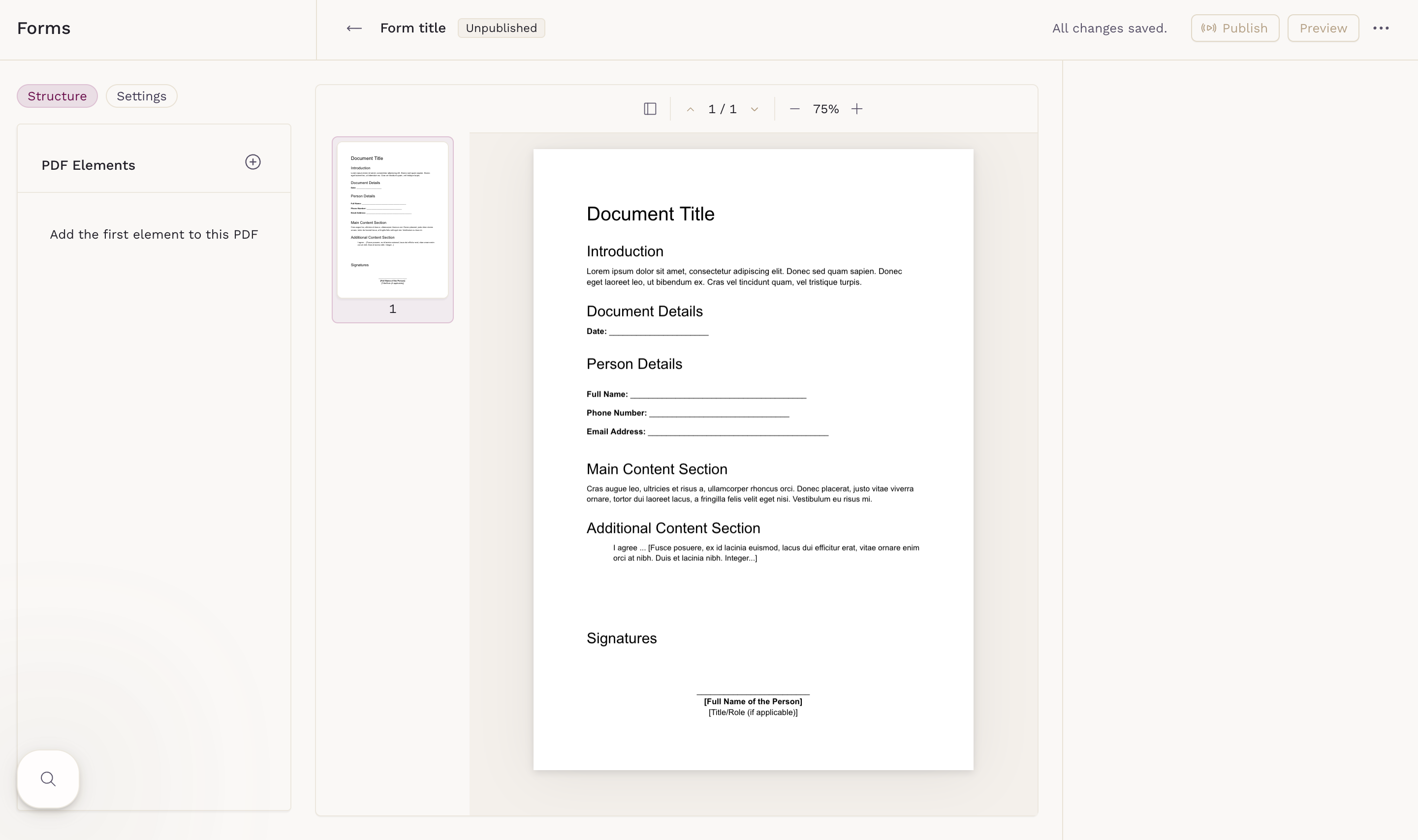 Once your form is complete and the preview looks right, select Publish. Published PDF forms can be: