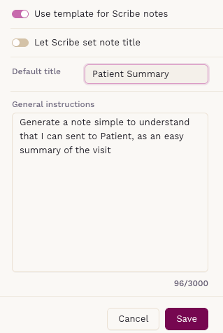After a note is generated, Scribe can automatically assign a title based on the note’s content. This helps maintain consistency and saves time when reviewing or organizing notes. However, if you prefer to control the title manually, you can disable this setting and define a default title for that template instead.