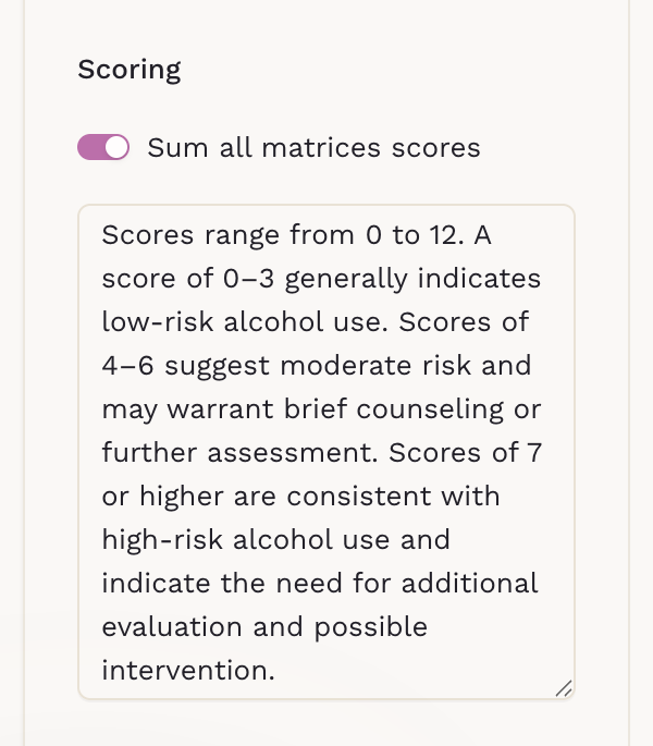 If your form includes more than one Scored Matrix question, you can choose to calculate a single total score across all matrices. In the Settings tab, enable Sum all matrices scores to combine the points from each scored matrix into one overall result.