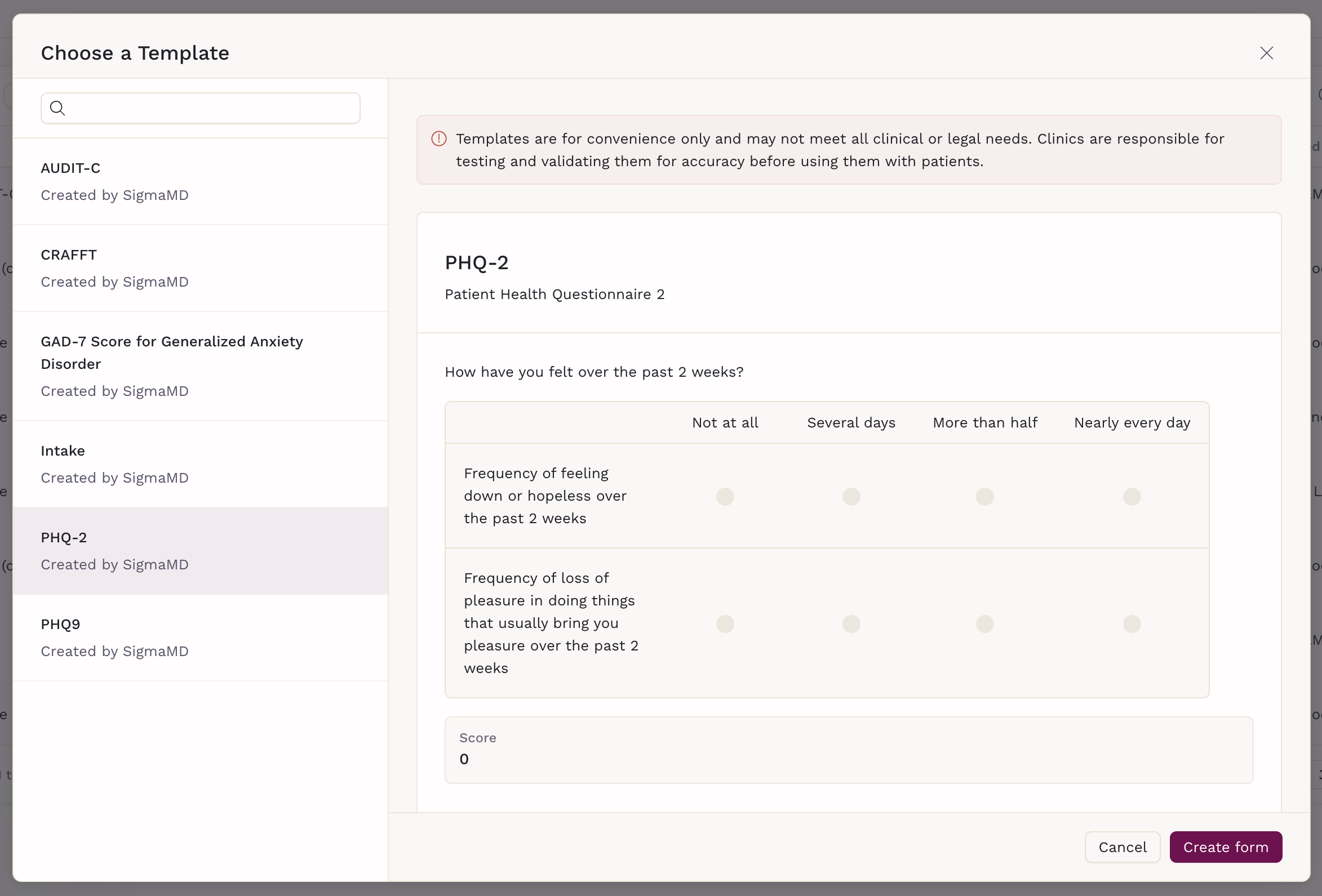 Scored Forms allow practices to collect structured responses and automatically calculate a score based on patient answers. They are commonly used for clinical screenings and assessments, such as mental health questionnaires, where a numeric result helps guide clinical decision-making.