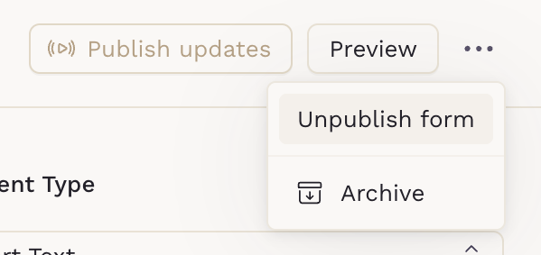 If a form has already been published but you no longer want to keep it, you can first unpublish it and then delete it. Unpublishing removes the form from active use, meaning it can no longer be sent to patients or linked to appointment types.