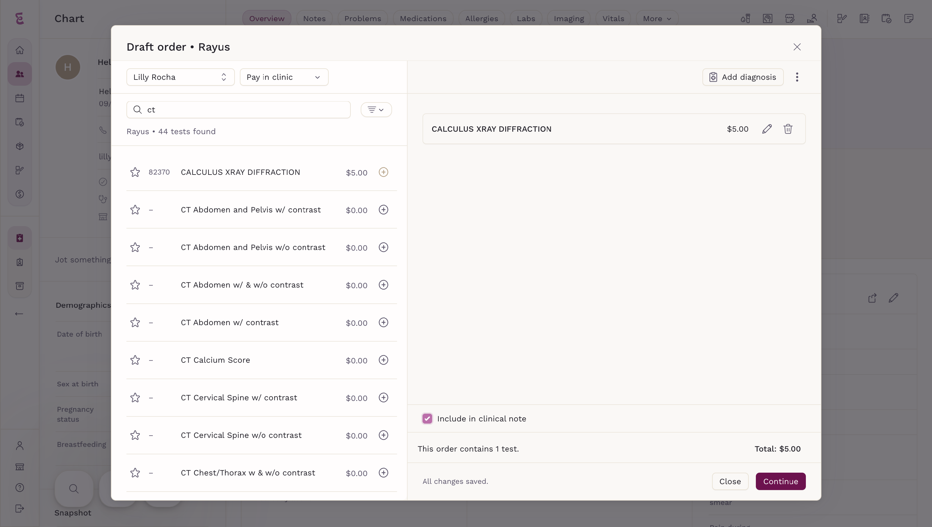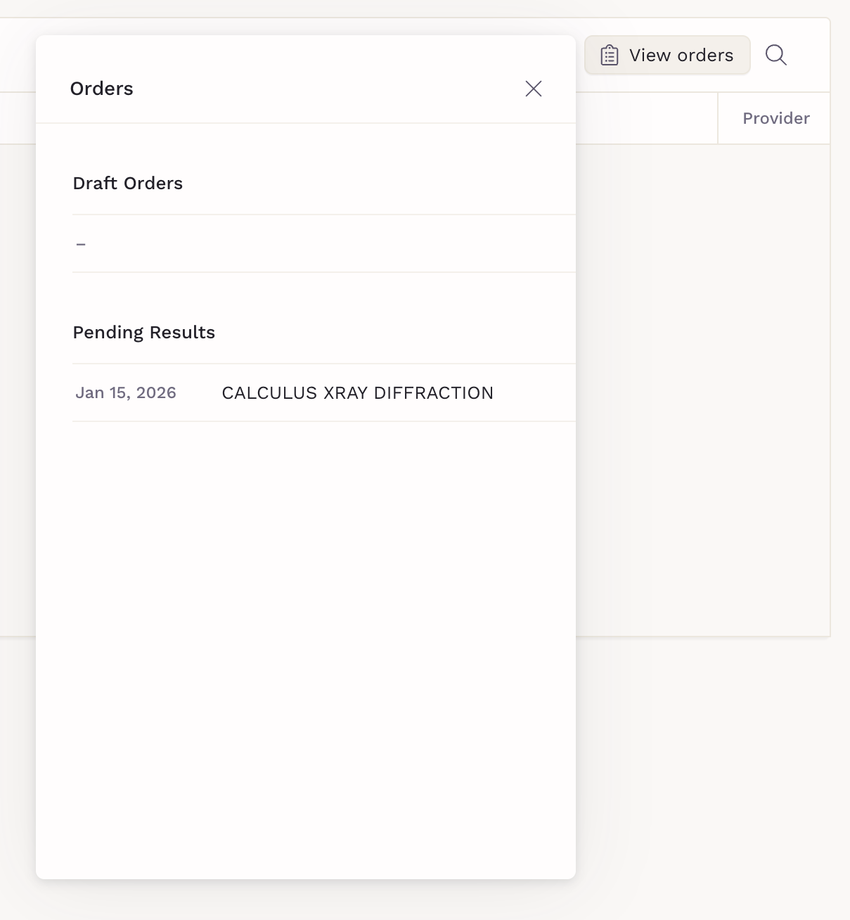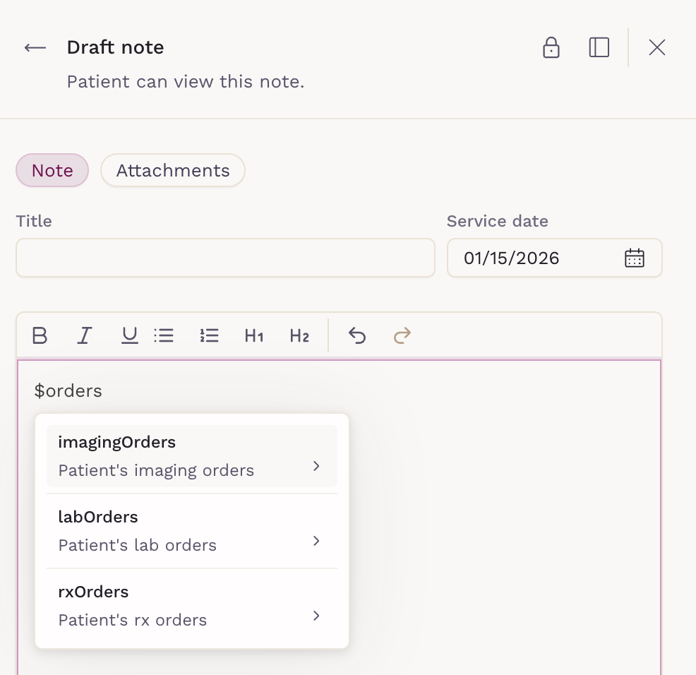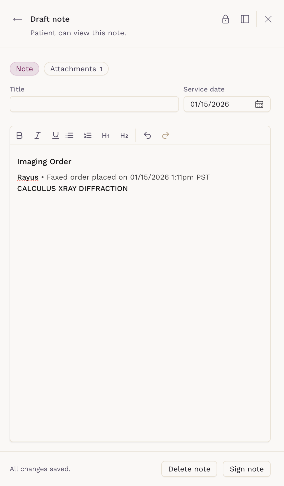 In both cases, the order is added to the open draft clinical note and will appear in the Attachments tab.