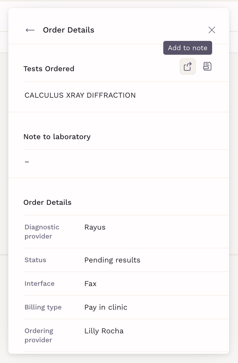 From the patient chart, create a new lab or imaging order. You can add it to the note using one of the following options:
