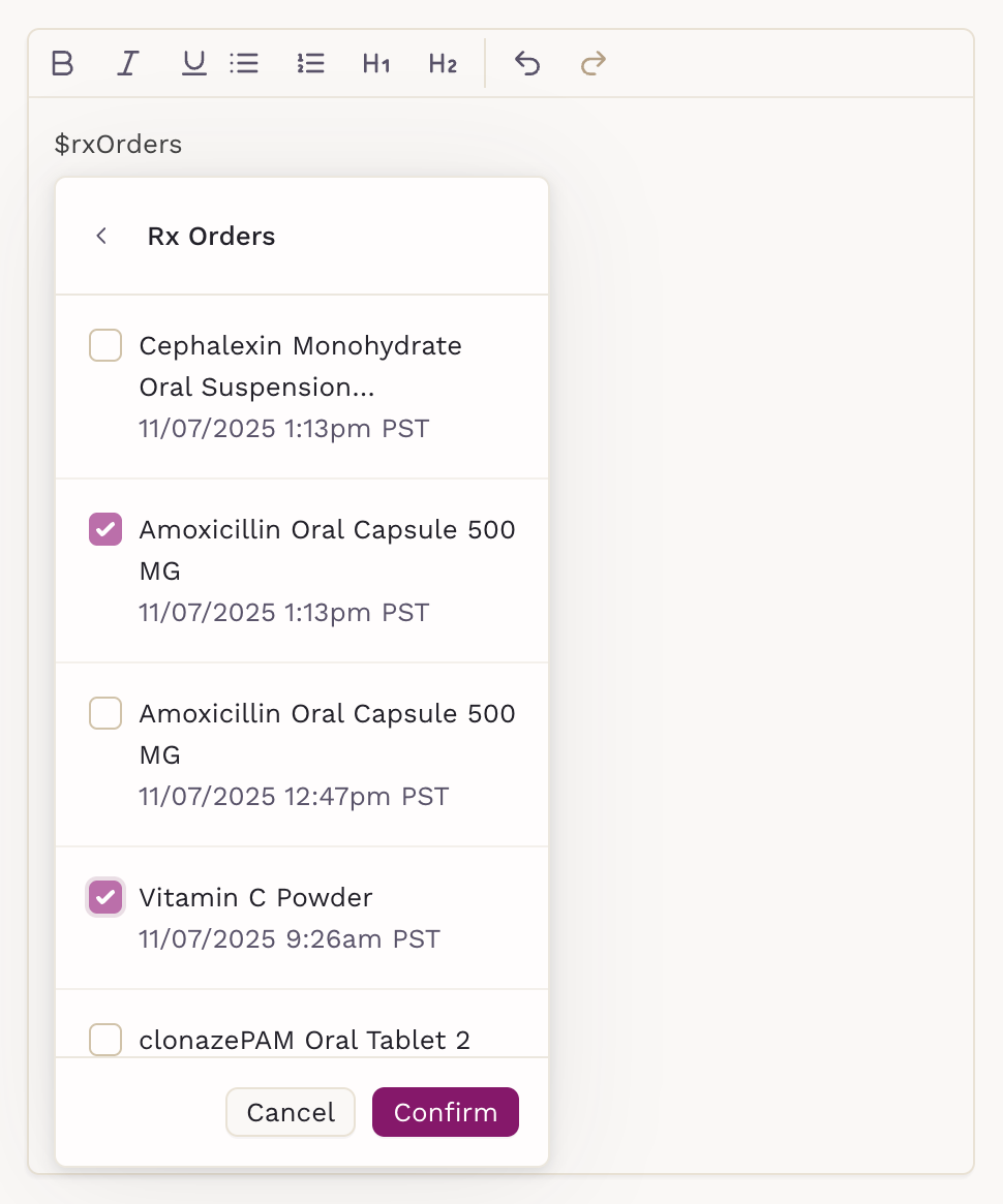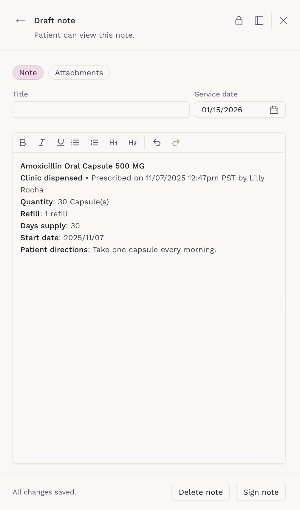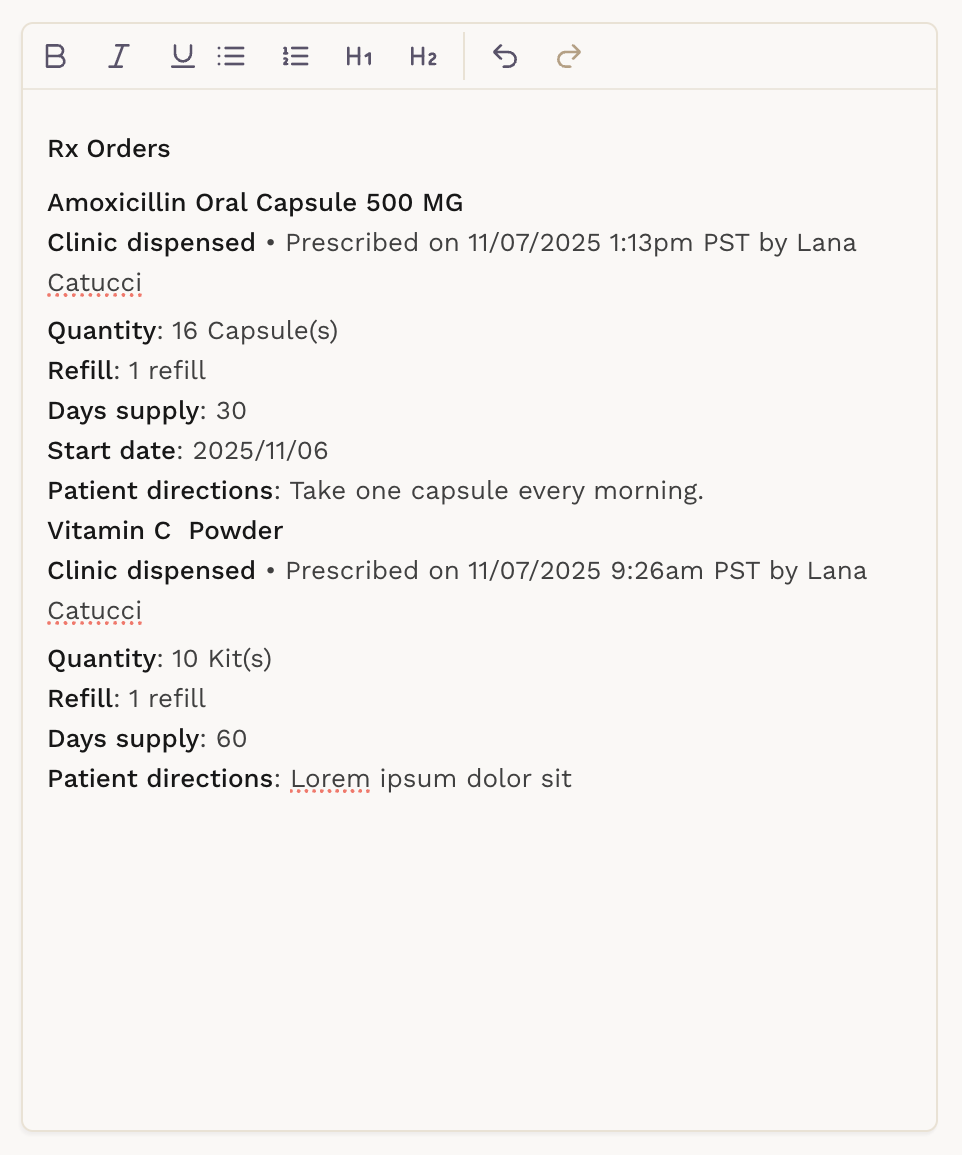 Prescription orders from both In-house dispensing or orders sent to pharmacies can be added to a clinical note.