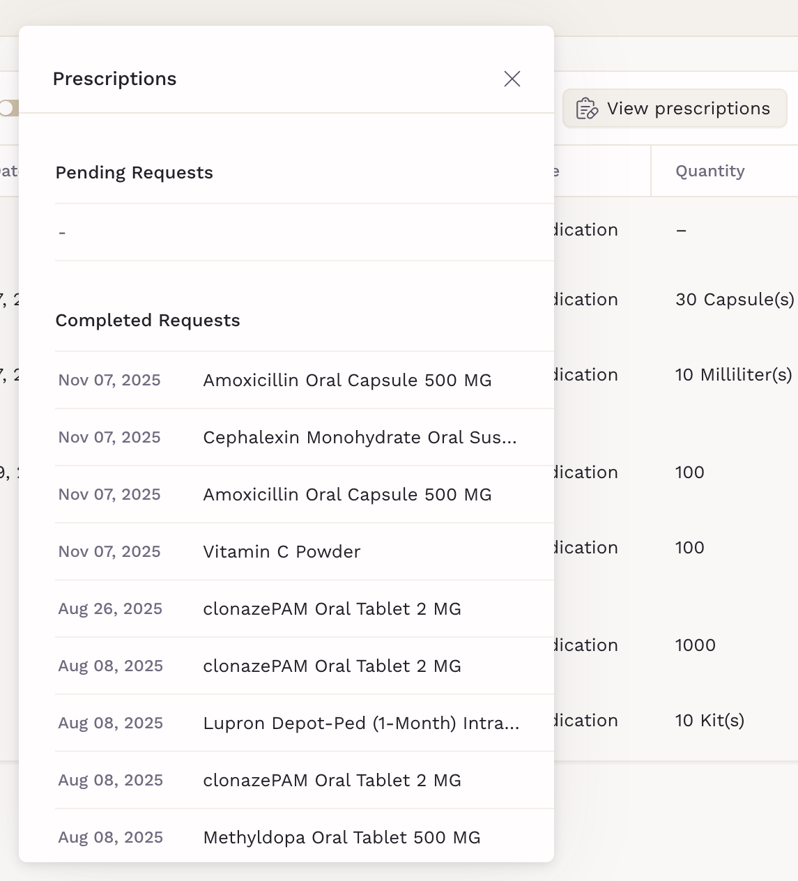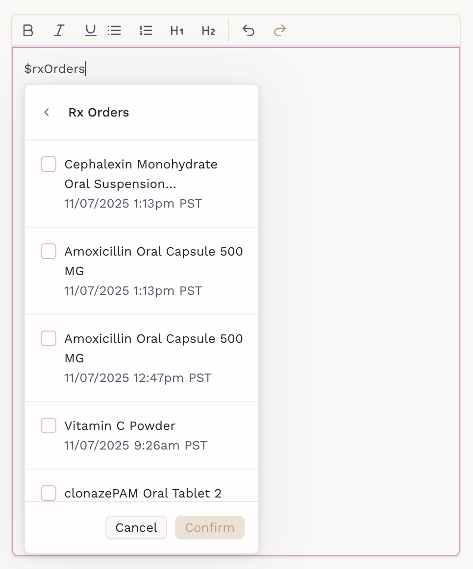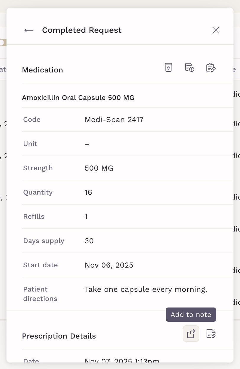 Prescription orders from both In-house dispensing or orders sent to pharmacies can be added to a clinical note.