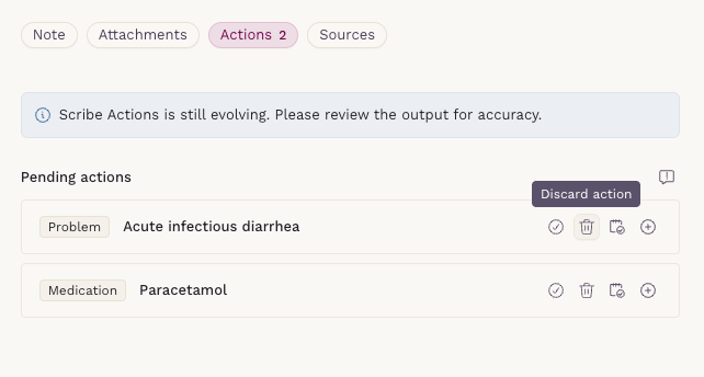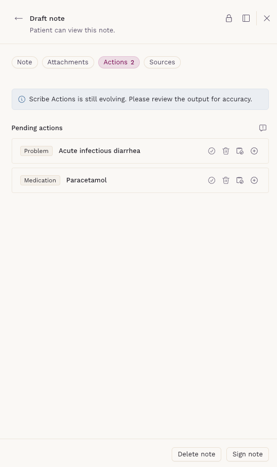 - Actions do not modify your clinical note. You can edit, discard, or complete them without affecting the note content.
