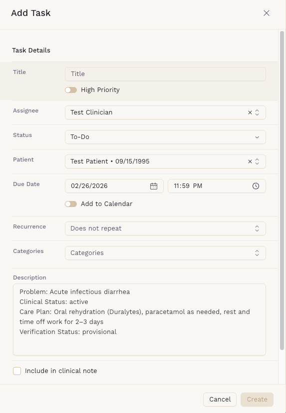 - The Task modal will open with suggested information prefilled.