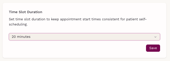 Time Slot Duration defines the interval between appointment start times when patients self-schedule. This setting increases scheduling flexibility without changing the actual visit duration.