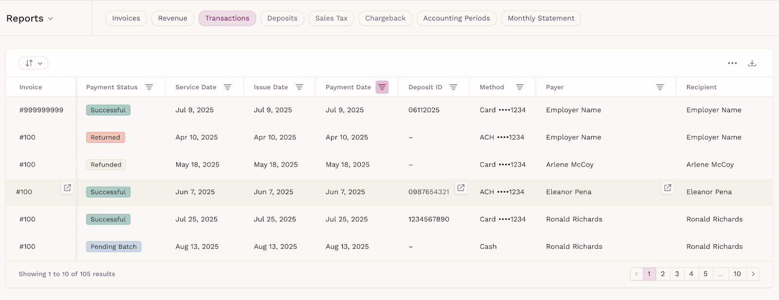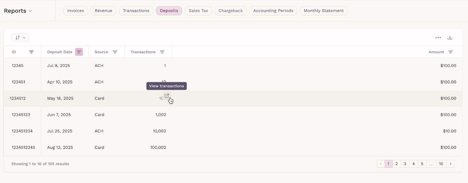 From the Transactions column, you can select View transactions to jump directly to the Transactions report filtered by that specific deposit. This makes it easy to understand exactly which payments were included in each deposit and supports faster reconciliation.
