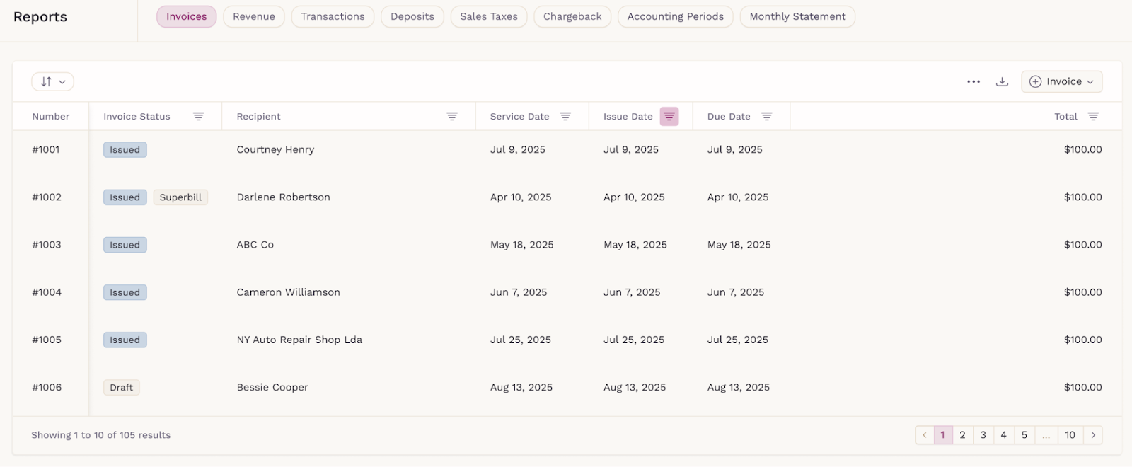 The Invoices report provides a detailed list of all invoices, including status, patient details, description, issue date, due date, and total amount. You can filter and sort invoices to quickly find specific records.