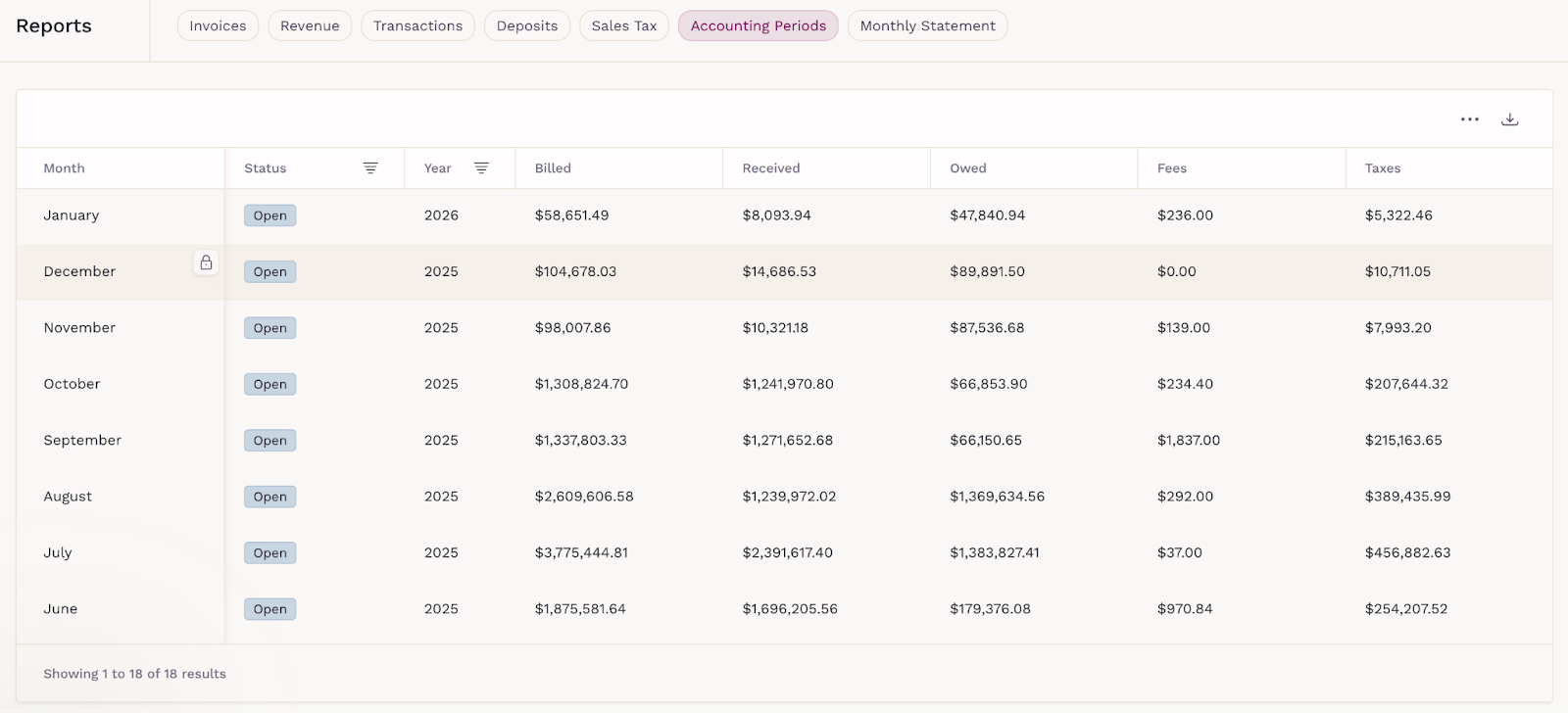 See monthly summaries of what was billed, received, still owed, fees incurred, and taxes collected. Accounting periods can be in one of three states: Open, Locked, or Unlocked, making this report especially useful for closing books or preparing financial statements.