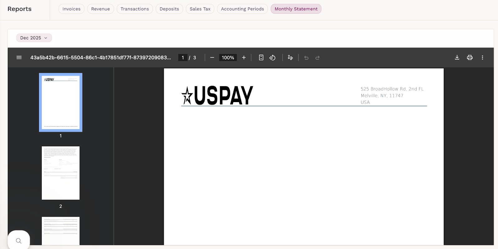 Provides a PDF statement from your payment processor (USPAY) with a summary of fees and activity for the month. Statements can be filtered by month and previewed within the app.