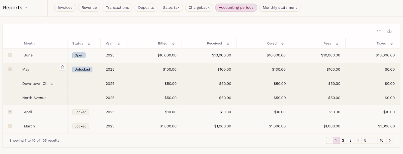 If your practice has multiple locations, you’ll see an expand icon on the left side of each month. This allows you to view accounting periods broken down by location.