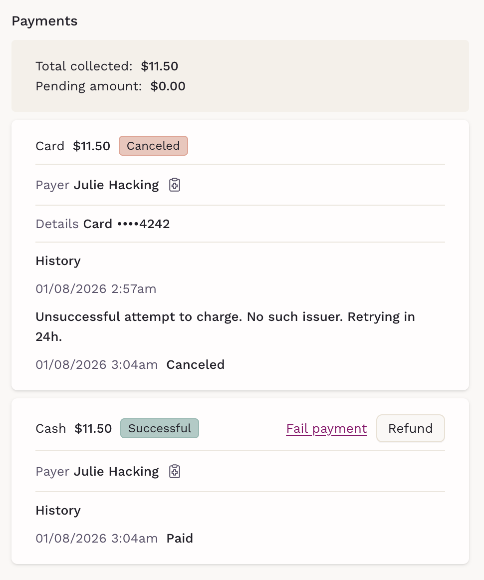 Each payment listed here includes its own status, so if multiple payments were used, you’ll see a status next to each method (e.g., cash, card, ACH).